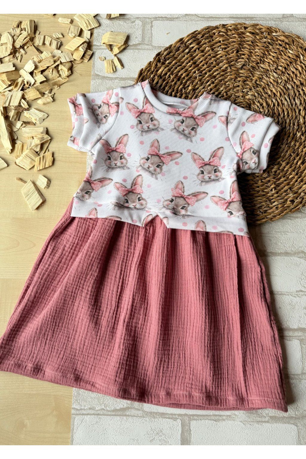 Slušivé šatičky se vzorem králíčků s mušelínovou sukýnkou ve velikosti 86.