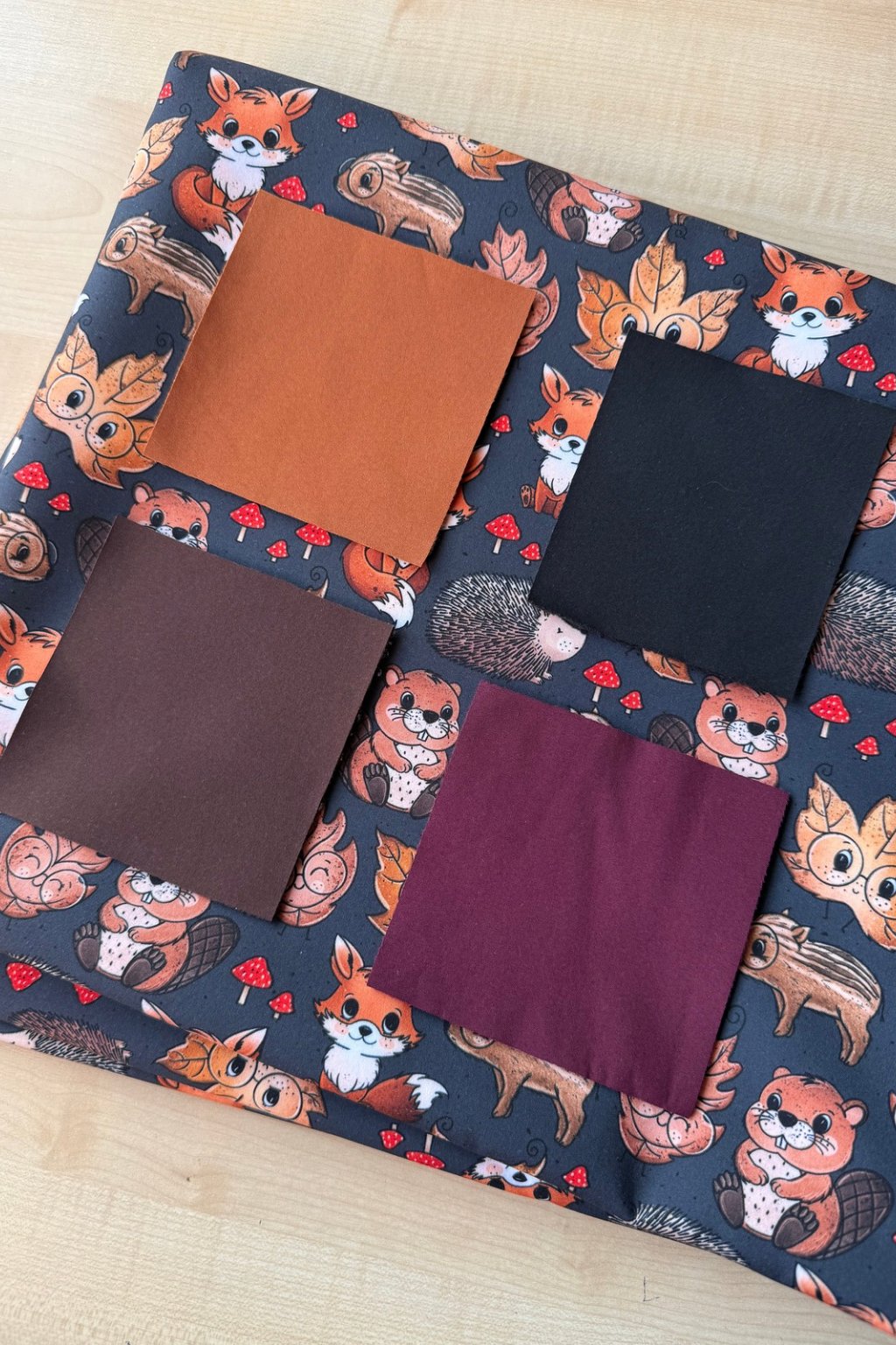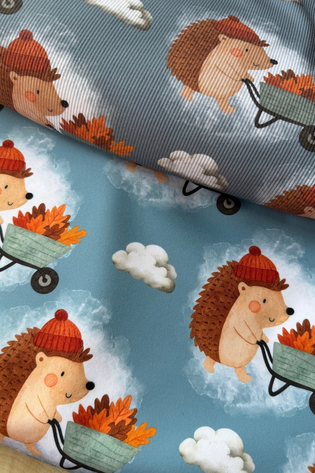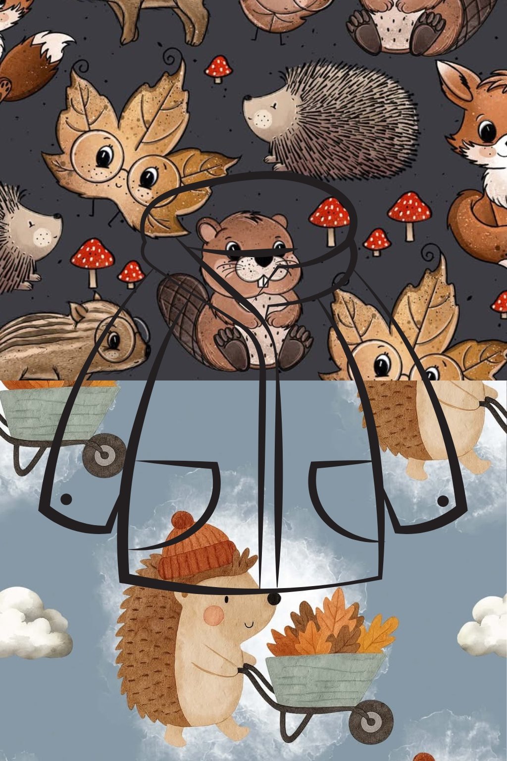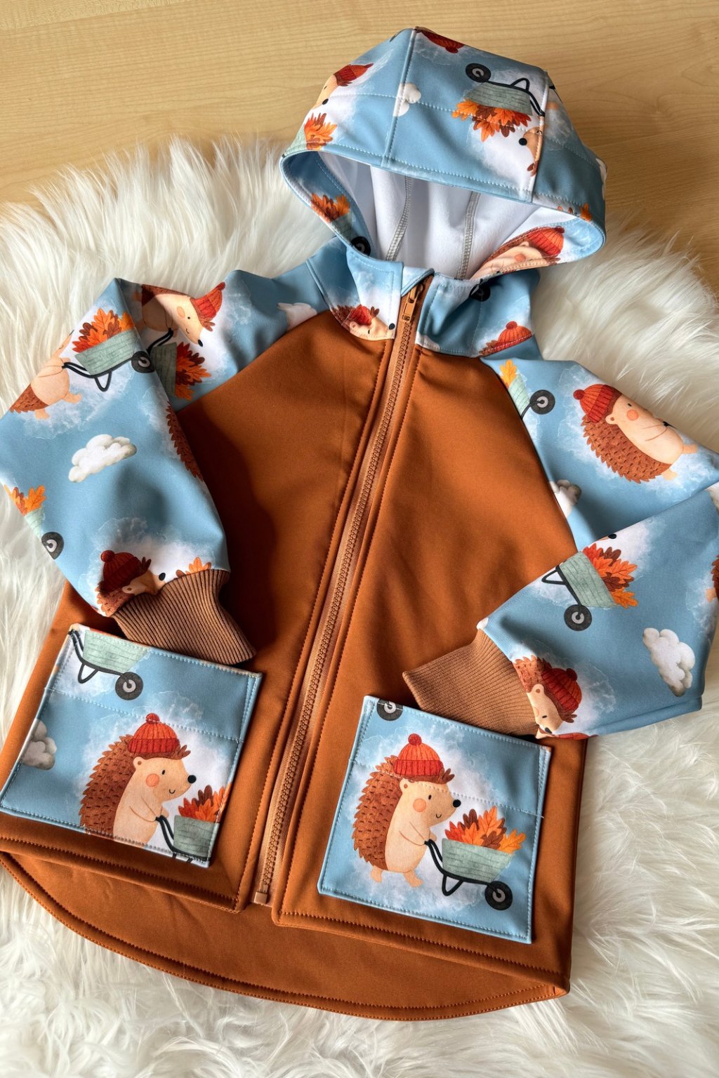 Například: Chtěla bych ježky na modrém podkladu nakombinovat s rezavým softshellem. Kapsy bych ráda ty první ozdobné (fotografie s ptáčky). Vzor prosím na celé kapuci, rukávech a na kapsách.