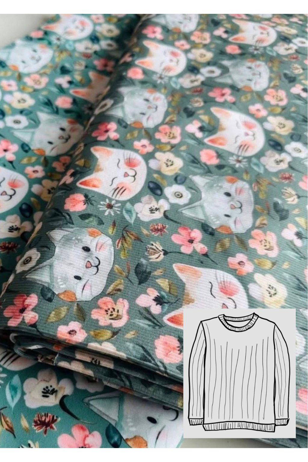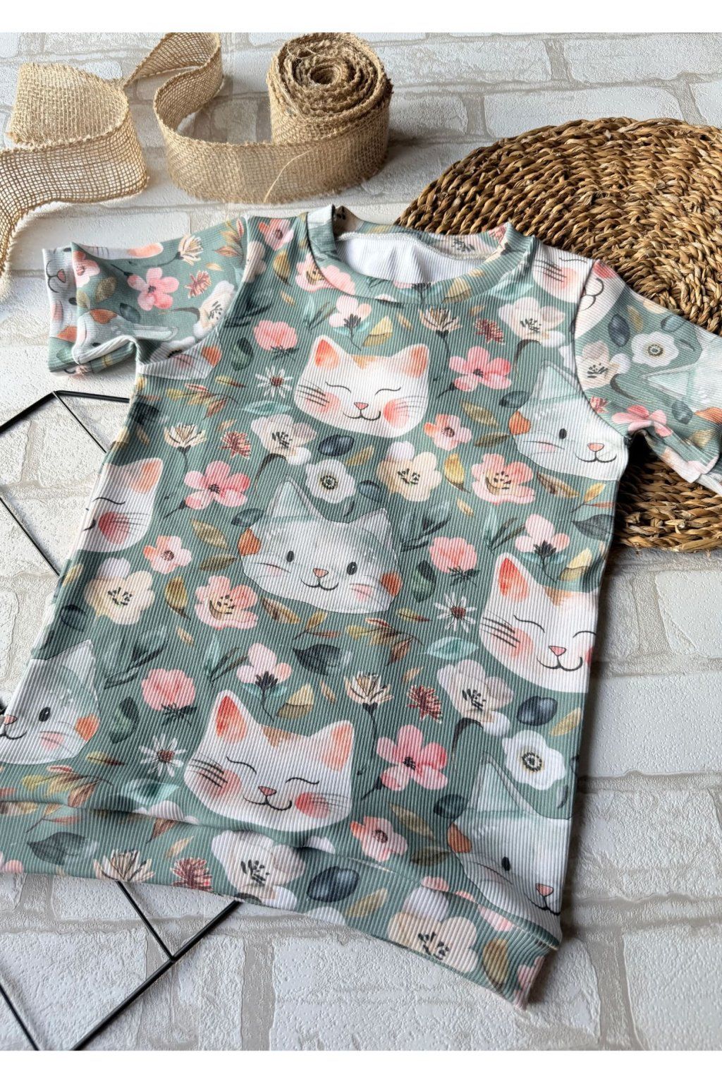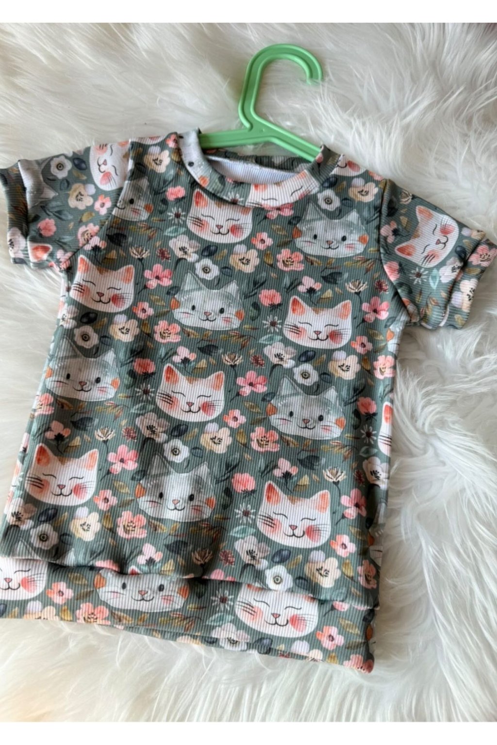 Krásný a jemný vzor kočiček na mátovém podkladu na padnoucím, rostoucím tričku, které si prostě zamilujete.